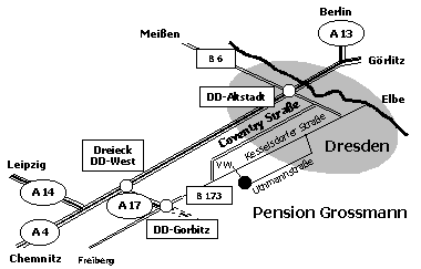 A4 bis Dreieck Dresden West - A17 bis Ausfahrt Dresden-Gorbitz. Richtung Dresden, nach Ortseingang Dresden, rechts abbiegen in Richtung Löbtau (Gewerbegebiet Gompitz), Kesselsdorfer Straße bis VW Autohaus Pattusch, danach 2. Ampel rechts in Uthmannstraße zur Pension.